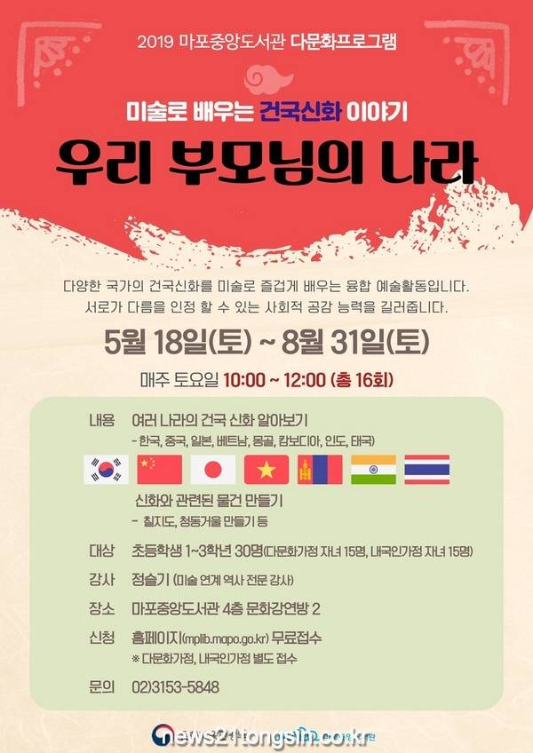 참여를 원하는 다문화 가정은 18일까지 마포중앙도서관 홈페이지(https://mplib.mapo.go.kr/mcl/)를 통해 신청할 수 있다. 프로그램 관련 기타 자세한 사항은 마포중앙도서관(☎02-3153-5848)에 문의하면 된다.