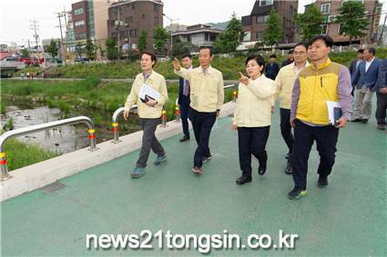 우선 증산빗물펌프장을 꼼꼼히 둘러보며 시설물 관리상태를 확인하고 2018년 침수피해를 입은 가구를 방문하여 주민을 위로하며 은평구에서만 준비하고 있는 침수취약가구에 설치한 안심양수기를 직접 시연하여 이용시 불편한 사항을 확인하였다. 이후 은평구의 대표하천인 불광천에 대해서도 시설물 유지관리 상태를 일일이 점검하였다.