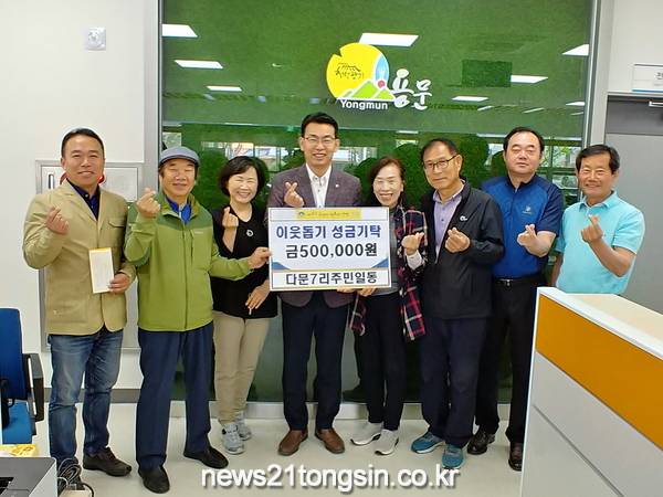 이에 용문면 윤건진 면장은 “용문면민이 한마음 한뜻으로 준비하고 성황리에 끝난 힐링로드 걷기행사에서 많은 준비와 노력을 해 준 것으로도 충분한데 어려운 이웃을 위해 이렇게 좋은 마음을 내어주신 다문7리 주민들에게 감사한다”며 이 마음을 담아 따뜻한 용문면이 될 수 있도록 노력하겠다고 밝혔다. 한편 기탁된 이웃돕기 성금은 경기도 공동모금회를 통하여 지역에 맞는 맞춤형 복지사업을 위하여 사용될 계획이다.