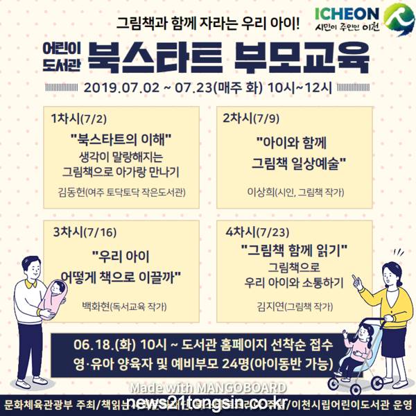 북스타트 부모교육에 관심이 있는 영·유아 양육자 또는 예비부모는 이천시통합도서관 홈페이지(www.icheonlib.go.kr)에서 사전신청 후 수강할 수 있다. 수강신청은 6월 18일 오전 10시부터로, 24명을 선착순으로 모집한다.