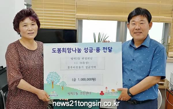 2011년 5월부터 2019년 4월까지 8년 동안 방학2동 28통장으로 활동해온 변정희 통장이 지역의 어려운 이웃들을 위해 써달라며 활동수당 중 일부인 100만원을 불우이웃돕기 성금으로 쾌척한 것.