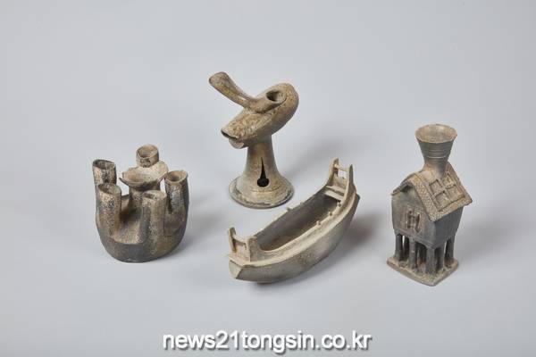배모양토기는 가야시대 준구조선을 형상화한 토기다.(길이 23.6㎝) 유선형의 선체에 파도를 막는 판재를 앞뒤로 대었으며, 양 측판의 윗면에는 각 5개씩의 노걸이가 배치되어 있다. 배의 뒷부분인 고물부가 뚫려 있어 잔(盞)으로 사용됐음을 알 수 있다.