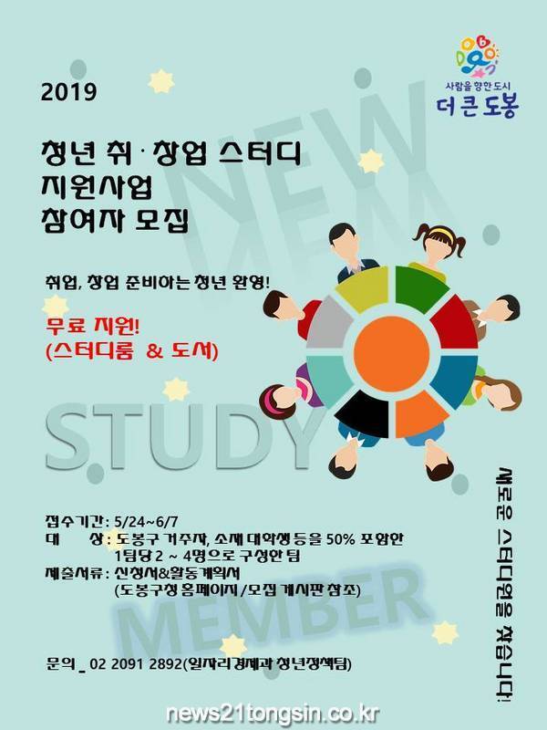 ▲ [사진=홍보포스터]도봉구(구청장 이동진)는 취업 준비생들에게 가장 부담스러운 비용으로 꼽히는 취업준비 비용 절감을 위해 ‘청년 취·창업 스터디 지원사업’을 진행한다.