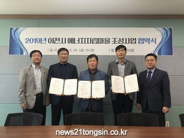 이천시는 24일 시청 7층 회의실에서 이건만 기업환경국장, 진암4리 마을협동조합 대표 이학로, 시공업체인 (주)케이디솔라 및 한국전력공사 이천지사의 관계자가 참석한 가운데 에너지 복지 실현 및 신재생에너지 보급·확산을 위한 ‘2019년 이천시 에너지자립마을 조성지원 사업’ 협약식을 개최했다고 밝혔다.