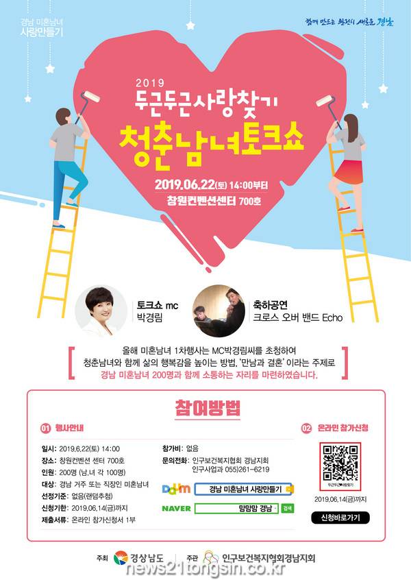 경상남도가 인구보건복지협회 경남지회와 공동으로 경남 미혼남녀를 대상으로 ‘두근두근 사랑찾기 청춘남녀 토크쇼’를 오는 6월 22일(토) 창원 CECO에서 실시한다.