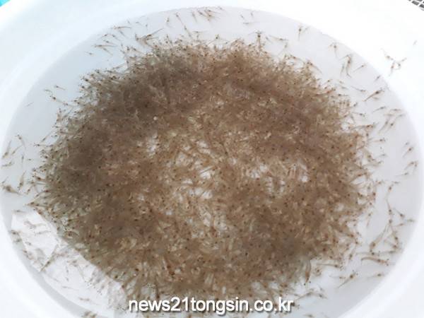 이번에 방류하는 어린 대하는 친환경양식에 이용되는 미생물인 바이오 플락(Bio-floc)을 이용한 갑각류 실험을 위한 결과물로 크기는 전장 1.2cm 이상의 질병검사를 거친 우량종자이다.