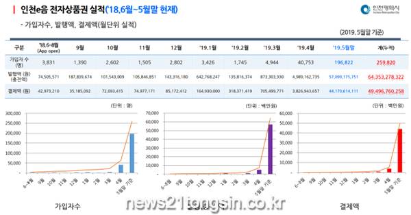 인천이(e)음의 발행액은 5월말 가입자가 259,820명, 발행액(충전액) 644억원, 결제액(사용액) 495억원으로 집계되었으며, 지난 1월부터 4월까지의 결제액과 비교하여 5월 한 달 동안의 결제액이 9배 가까이 증가하여 폭발적인 상승세를 보이고 있다. ‘미추홀이(e)음’이 7월에 발행되면, 이미 발행중인 ‘서로이(e)음’과 6월말 발행될 ‘연수이(e)음’과 더불어, 인천이(e)음의 사용율은 더욱 가속화될 것이며, 인천지역 경제에 활력을 불어넣는 견인차 역할을 톡톡히 해낼 것으로 기대하고 있다.