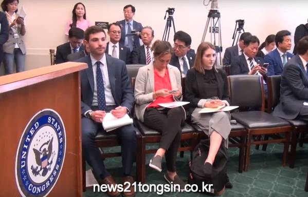 50여 석 규모의 회의장은 셔먼 위원장을 비롯한 하원의원 3명과 10여 명의 보좌관, 의회 측 인원과 비슷한 수의 한국에서 온 개성공단 관계자들, 또 취재기자들로 빈자리 없이 가득 찼다.