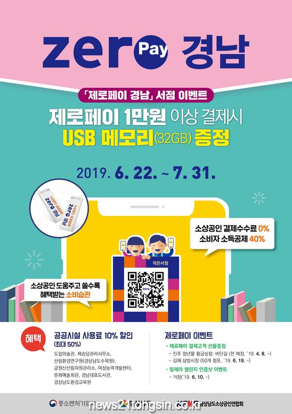 먼저, 온라인 서점에 밀려 어려움을 겪고 있는 동네 서점을 도민들이 다시 찾고 책을 가까이 하는 지식문화 공간으로 거듭나도록 ‘제로페이 경남 서점이벤트’를 실시한다. 서점 이벤트는 6월 22일부터 7월 31일까지 진행되며, 창원시내 서점(31개소)에서 제로페이로 결제하는 고객을 대상으로 제로페이 홍보물(USB 메모리)을 증정한다.