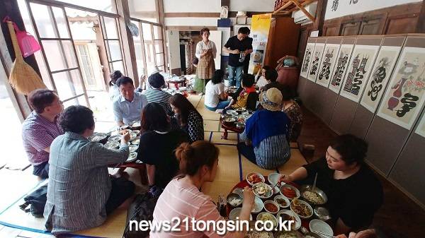 ▲ 안동시 도산면 토계리에 위치한 안동고택 수졸당 에서 참가자들이 정갈하게 차려진 내림음식상(건진 국수)을