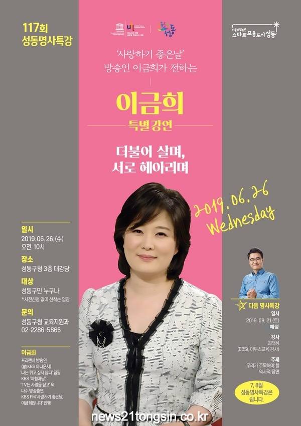 ▲ 사진=홍보포스터성동구(구청장 정원오)는 오는 6월 26일 오전 10시 구청 3층 대강당에서 이금희 아나운서를 초청해 제117회 성동명사특강을 개최한다.