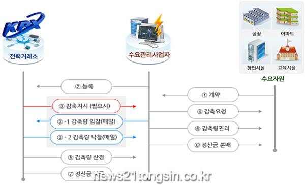 전력수요관리사업이란, 전력 수급이 불안정할 때 전력거래소의 전력사용 감축지시 발령에 따라 전력소비자가 절전을 이행하고 추후 실적이행금을 정산받는 사업이다