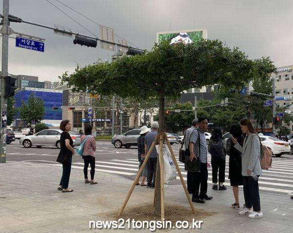 마포구(구청장 유동균)가 최근 보행자가 많은 주요 지역 교통섬과 횡단보도 인근에 햇볕을 피하는 용도의 친환경 그늘목을 식재해 눈길을 끈다.