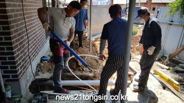 전국보일러설비협회 이천지회는 6월 24일 월요일 율면 소재 독거노인 가구를 대상으로 ‘노후 수도배관 교체 봉사’ 활동을 펼쳤다. 누수와 그로 인한 습기 문제를 해결하기 위해 지회에서는 굴착기와 장비를 이용해 노후한 상수도 및 주방 배관을 신관으로 교체했다.