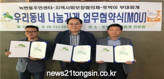 은평구(구청장 김미경) 녹번동주민센터, 녹번동 지역사회보장협의체 및 토박이 부대찌개 (대표 전성배)는 2019년 6월 26일(수) 반찬 나눔 가게 협약식을 체결하였다.