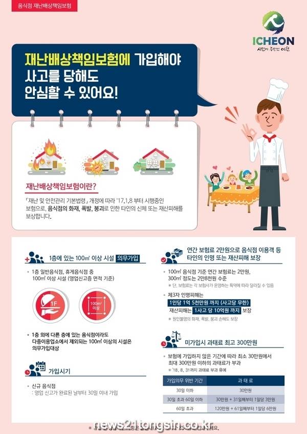 이천시는 재난배상책임보험 집중 갱신기간이(7~8월) 도래됨에 따라 업종별로 갱신 가입 시기를 놓쳐 과태료가 부과되는 일이 없도록 집중적으로 가입홍보에 나섰다.