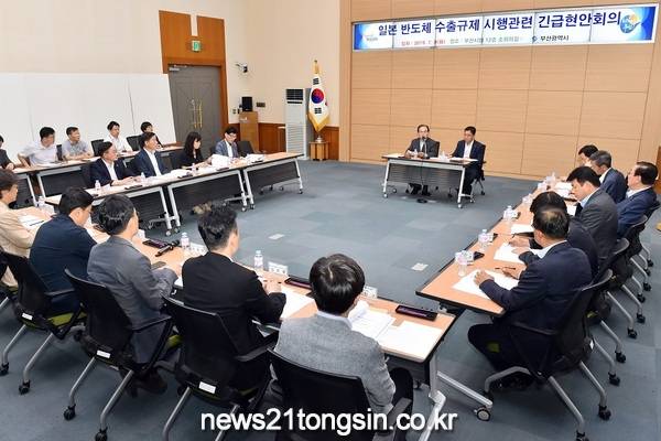 부산시(시장 오거돈)는 7월 9일 오후 4시 시청 12층 소회의실에서 상공계 및 관계기관, 기업계 대표들과 「일본 반도체수출규제 시행관련 긴급 현안 회의」를 개최하고 관련 동향을 점검, 대응방안을 논의했다.