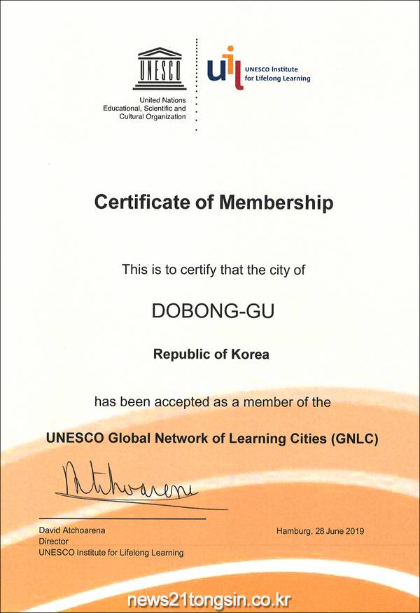 ▲ [사진=인증서]도봉구(구청장 이동진)가 유네스코 평생학습 연구소(UNESCO Institute for Lifelong Learning, UIL)에서 주최한 ‘2019 유네스코 글로벌 학습도시 네트워크(UNESCO Global Network of Learning Cities, GNLC)’에 6월 28일자로 회원가입 승인을 최종 통보 받았다.