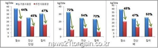 그 결과 ▲단감농가는 10a당 질소 16.3kg, 인산 11.3kg, 칼리 14.4kg, ▲사과농가는 질소 23.2kg, 인산 13.4kg, 칼리 16.8kg, ▲배농가는 질소 17.4kg, 인산 12.0kg, 칼리 14.6kg으로 과잉 시비되고 있는 것으로 나타났다.