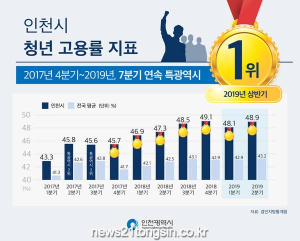 인천시(시장 박남춘)가 2019년 상반기에도 청년고용률 전국 특·광역시 1위를 달성, 2017년 4분기부터 7분기 연속 특·광역시 1위를 차지했다.