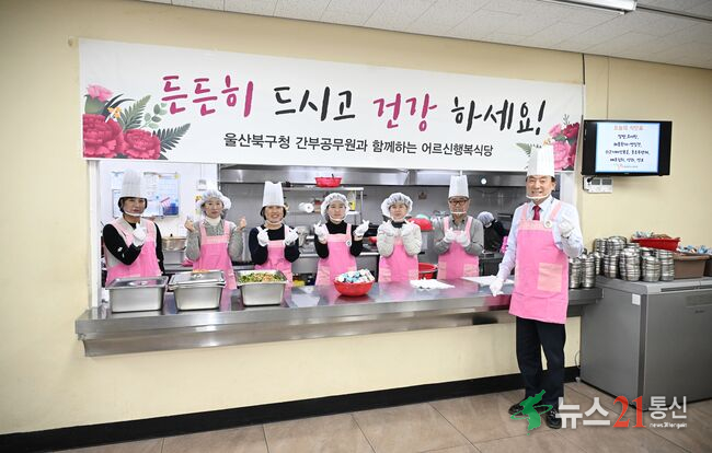 - [뉴스21 통신=최병호 ](사진출처=울산북구청)북구청 간부 공무원들은 13일 북구노인복지관 어르신행복식당에서 설맞이 배식 봉사활동을 했다.