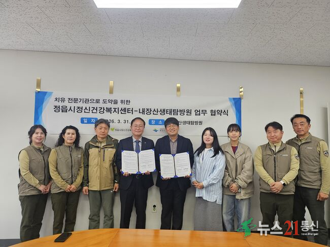 [전북뉴스21통신/김문기 기자]=국립공원공단 내장산생태탐방원과 정읍정신건강복지센터가 ㅈ;난 31일 정신건강증진 및 자연치유 생태관광 활성화를 위한 업무협약을 체결했다. 이번 협약은 양 기관이 상호신뢰를 바탕으로 유기적인 협력 관계를 구축하고, 자연에서 정신건강을 찾는 자연치유 생태관광을 활성화함으로써 지역 상생 효과 창.