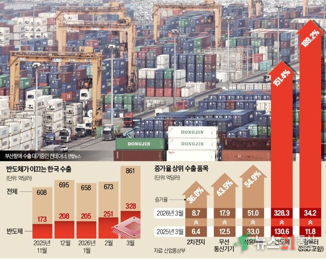 [뉴스21 통신=추현욱 ] 한국 수출이 지난달 미국·이란 전쟁의 소용돌이 속에서도 사상 최대인 861억달러를 기록했다. 700억달러를 웃돈 적이 없는 월간 수출액이 단숨에 800억달러를 넘어 900억달러까지 바라보게 됐다. 300억달러 이상 수출한 반도체가 전체 수출 증가를 견인했다.산업통상부는 올해 3월 수출이 지난해 같은 기간보다 48.3% 증...