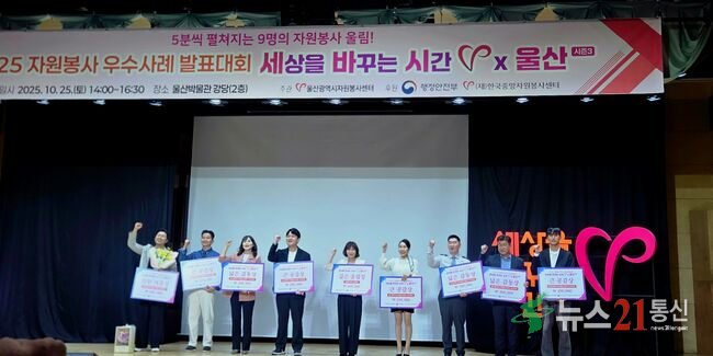 [뉴스21 통신=최세영 ]울산시자원봉사센터는 10월 25일 오후 울산박물관 2층 대강당에서 ‘세상을 바꾸는 시간 2025 자원봉사 우수사례 발표대회’를 개최했다.‘세상을 바꾸는 시간’은 올해 시즌3을 맞아 자원봉사자들이 직접 경험한 소중하고 의미 있는 이야기를 스토리텔링 형식으로 발표함으로써, 시민들에게 감동과 울림을 ...