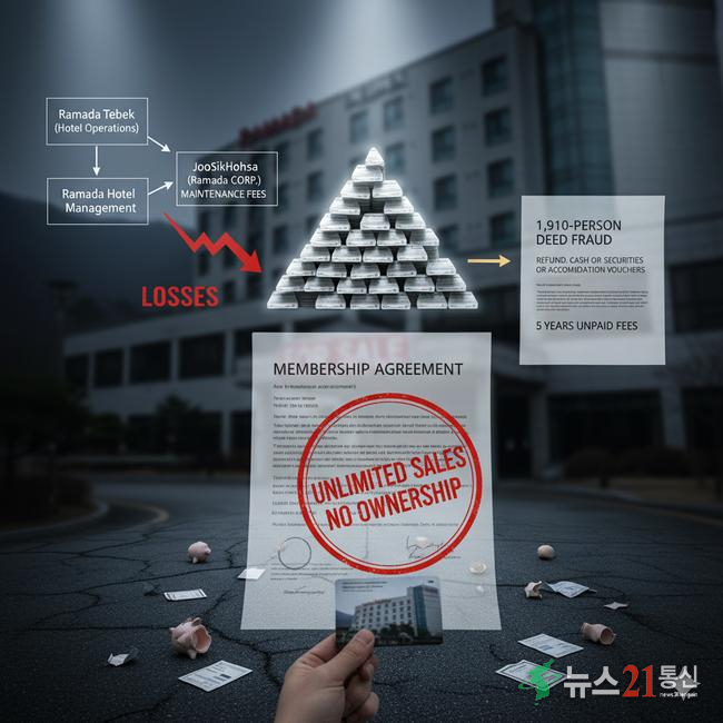 [서울/태백=서민철 기자] 태백 라마다 호텔 사태가 1,910명의 '지분 쪼개기' 등기 분양 문제로 알려진 것과 달리, 실제로는 '무제한 멤버십 회원권' 판매를 통한 변칙적 수익 창출이 더 심각한 문제의 본질이라는 내부 관계자의 충격적인 증언이 나왔다.