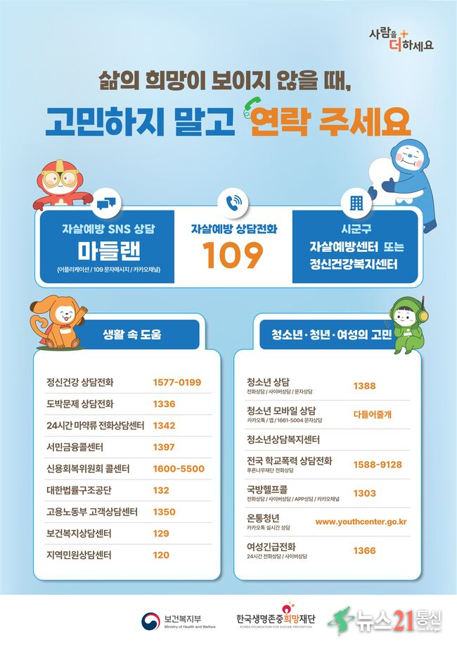 [뉴스21 통신=이준범 ]담양군이 일조량 변화 등 계절적 요인으로 우울감이 높아지기 쉬운 봄철을 맞아, 오는 5월까지 ‘자살 고위험시기 집중 관리’를 실시하며 군민 마음 건강 지키기에 나섰다.이번 집중 관리는 심리적 박탈감을 느끼기 쉬운 시기에 위험군을 조기에 발견하고, 적기에 전문적인 치료와 상담을 받을 수 있도록 통합 관...