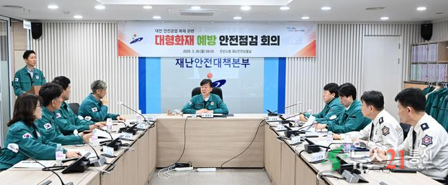 안산시는 대형 화재 예방과 대응 역량 강화를 위해 관계기관과 함께 안전 점검 대책 회의를 개최했다고 31일 밝혔다.시에 따르면 지난 30일 안산시청 4층 재난안전상황실에서 열린 이번 회의에는 이민근 안산시장을 비롯해 안산시와 안산소방서 관계자들이 참석했다.이번 회의는 최근 대전에서 발생한 안전공업(주) 화재를 계기로 마련됐으..