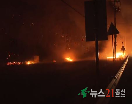 산길을 따라 불길이 치솟고, 연기 속에는 탄소와 메탄, 아산화질소 같은 온실가스가 다량 포함돼 있어 산불은 기후변화를 가속화하는 요인이 된다.