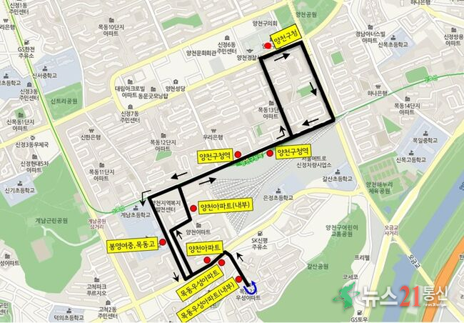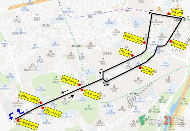 운행구간은 ▲신월3동주민센터 ~ 까치산역 ▲국립과학수사연구소 ~ 목동역 ▲서부트럭터미널 ~ 오목교역 ▲(신정7동)목동우성아파트 ~ 양천구청역 총 4개 노선으로 운영한다.