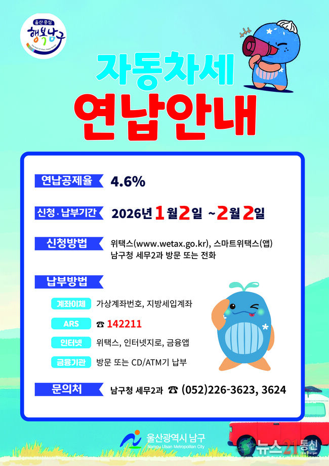 [뉴스21 통신=최세영 ] 울산 남구(구청장 서동욱)는 오는 2월 2일까지 올해 1월 자동차세 연납 신청을 접수한다고 밝혔다. 자동차세 연납은 매년 6월과 12월 두 차례 정기 납부하는 자동차세를 일시에 납부하면 납부 시기에 따라 세액을 공제해 주는 제도로 지난해와 동일하게 1월 연납은 연세액의 약 4.6%가 공제된다. 자동차세 연납 신...