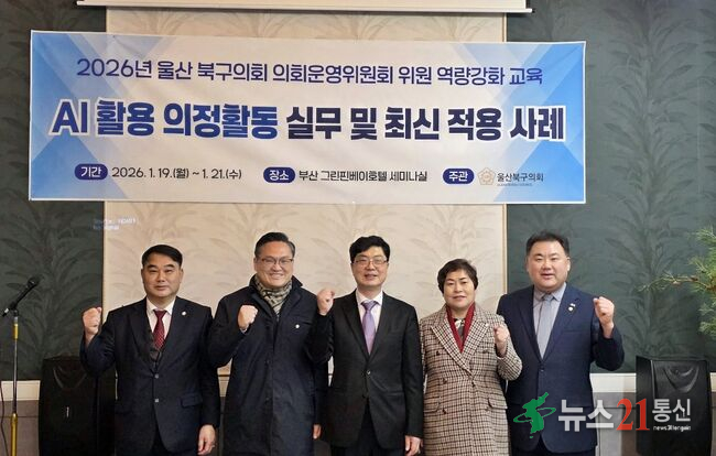 [뉴스21 통신=최병호 ](사진출처=울산북구의회)울산북구의회 의회운영위원회가 디지털시대에 걸맞은 의회 전문성 강화를 위해 인공지능(AI)을 활용한 의정활동 실무 능력 향상에 박차를 가하고 있다. 북구의회는 의회운영위원회 박재완 위원장과 손옥선, 박정환, 임채오 총 4명의 의원이 19일부터 21일까지 부산 그린핀베이호텔에서 열리는 ㈜...