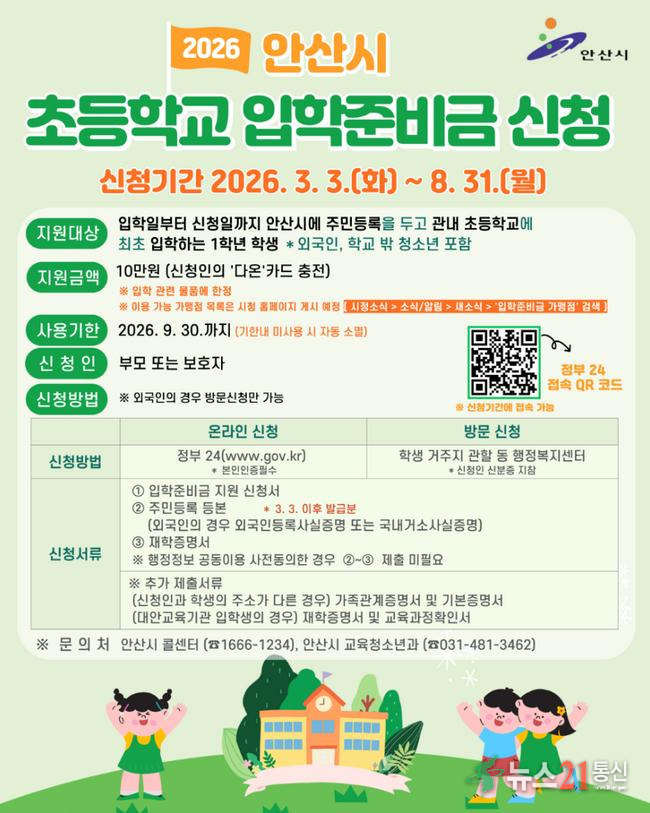 안산시는 초등학교 입학준비금 지원사업을 신규 도입해 안산시에 주민등록을 둔 초등학교 입학생에게 10만 원을 지역화폐로 지급한다. 이는 물가 상승과 교육비 부담 증가로 어려움을 겪는 학부모들을 지원하기 위한 것으로, 입학 초기 단계부터 안정적인 학업 환경을 조성하고자 하는 취지다.