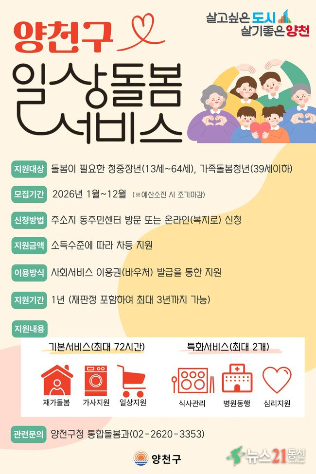 양천구(구청장 이기재)는 일상생활에 어려움을 겪는 청·중장년과 가족돌봄청년을 더욱 두텁게 지원하기 위해 2026년부터 ‘일상돌봄 서비스’를 확대 시행한다고 10일 밝혔다. 기존 만 19세 이상이던 청·중장년 연령 기준을 만 13세 이상으로 낮추고, 지원 기간도 6개월에서 1년으로 2배 확대했다. 또 가족돌봄청년의 경제적 부...