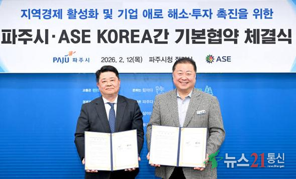 파주시가 지역 경제 활성화 및 기업 애로 해소·투자 촉진위해 반도체샐산업체인 ASE Korea와 투자촉진 및 지역 경제 활성화를 위한 협약을 체결했다. 파주시 제공파주시가 지난 12일 지역 경제 활성화 및 기업 애로 해소·투자 촉진위해 반도체 생산업체인 ASE Korea와 투자촉진 및 지역 경제 활성화를 위한 협약을 체결했다. 이번 협약은...