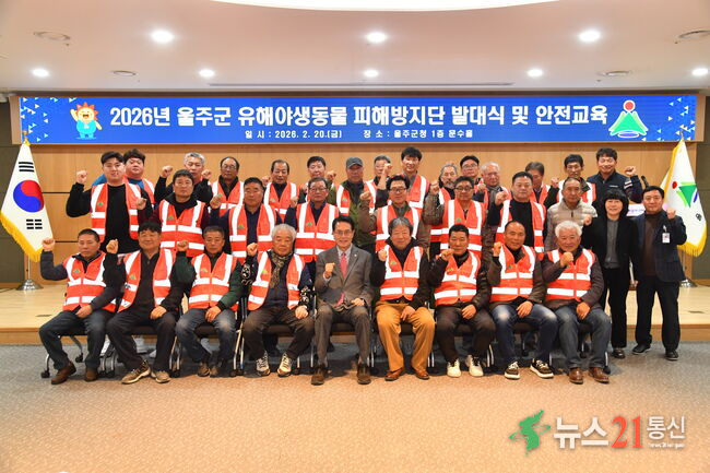 울산 울주군이 20일 군청 문수홀에서 ‘2026년 유해야생동물 피해방지단’ 발대식과 안전교육을 실시했다.이날 발대식에서는 공개모집을 통해 선발된 수렵인 유해야생동물 피해방지단 30명에게 위촉장을 수여했으며, 유해야생동물 피해방지단 안전교육과 유해야생동물 피해방지단 준수사항 교육을 진행했다.유해야생동물 피해방지단...