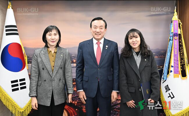 [뉴스21 통신=최병호 ](사진출처=울산북구청)박천동 북구청장이 19일 구청장실에서 전입 및 임기제공무원에게 임용장을 수여한 후 기념촬영을 하고 있다.