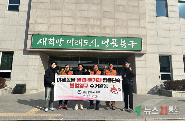 [뉴스21 통신=최병호 ](사진출처=울산북구청)북구는 20일 야생생물관리협회 울산지회, 북구 유해야생동물 피해방지단과 함께 야생동물 밀렵·밀거래 합동 단속 및 불법 포획도구 수거활동을 진행했다.