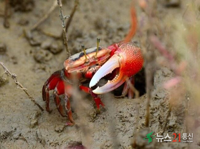 갯벌에서 서식하는 **게**는 주로 진흙이나 모래 속에 굴을 파고 생활한다.