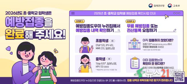 올해 초·중학교 입학생을 둔 보호자는 질병관리청 예방접종도우미 누리집(https://nip.kdca.go.kr)에서 자녀의 접종 내역을 확인하고 접종을 완료하지 않은 경우 가까운 위탁의료기관을 방문하면 무료로 접종받을 수 있다. 접종을 마쳤는데도 누리집에서 확인되지 않으면 해당 의료기관에 전산 등록을 요청하면 된다.