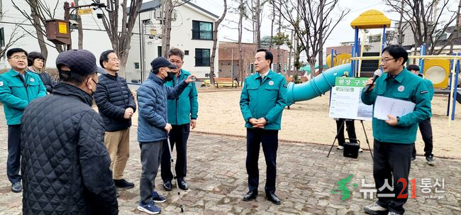 북구는 26일 연암동 안산공원에서 현장구청장실을 열고, 놀이터 바닥재 교체 건의에 관한 주민 의견을 청취했다.