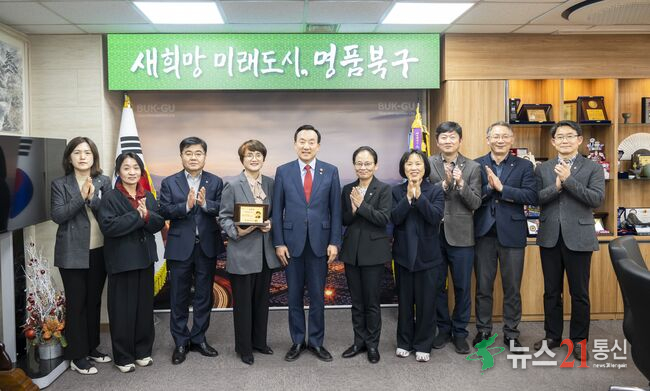[뉴스21 통신=최병호 ](사진출처=울산북구청)박천동 북구청장이 27일 구청장실에서 5급 승진자에게 임용패를 수여한 후 간부공무원들과 기념촬영을 하고 있다.