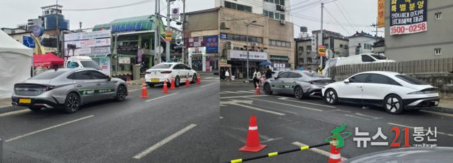 빨간오뎅 축제 현장에서 모범운전자들이 교통정리를 하는 가운데, 이들이 이용한 택시 차량이 도로에 정차돼 차로 일부를 차지하고 있다. 라바 콘이 설치된 도로에서 정차 차량으로 인해 차량 통행이 다소 불편을 겪는 모습이다.
