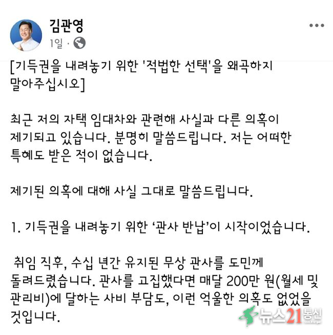 김지사는 취임 직후 수십 년간 유지돼 온 무상 관사를 도민에게 돌려드리고, 도청 1㎞ 이내 거처를 찾아 아파트를 임대했다고 설명했다. 또 중개업소를 통해 제시된 임대 조건을 그대로 수용했으며, 보증금 외에 전월세 전환율 4%를 적용한 만큼 별도의 경제적 이득이나 편익은 없었다고 주장했다.