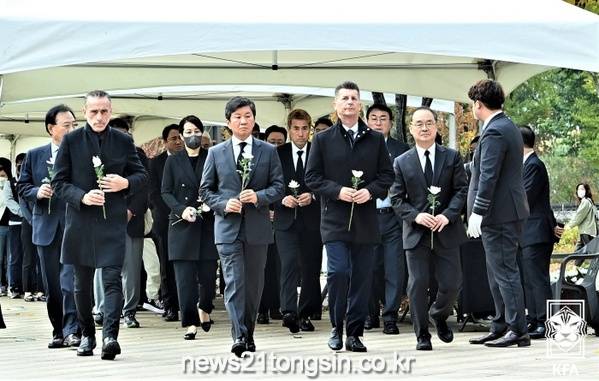 ▲ 사진=대한축구협회정몽규 대한축구협회장을 비롯한 협회 임원진과 파울루 벤투 남자대표팀 감독, 콜린 벨 여자대표팀 감독이 1일 오전 서울시청 앞 광장에 마련된 이태원 사고 희생자 분향소에 들러 조문했다.