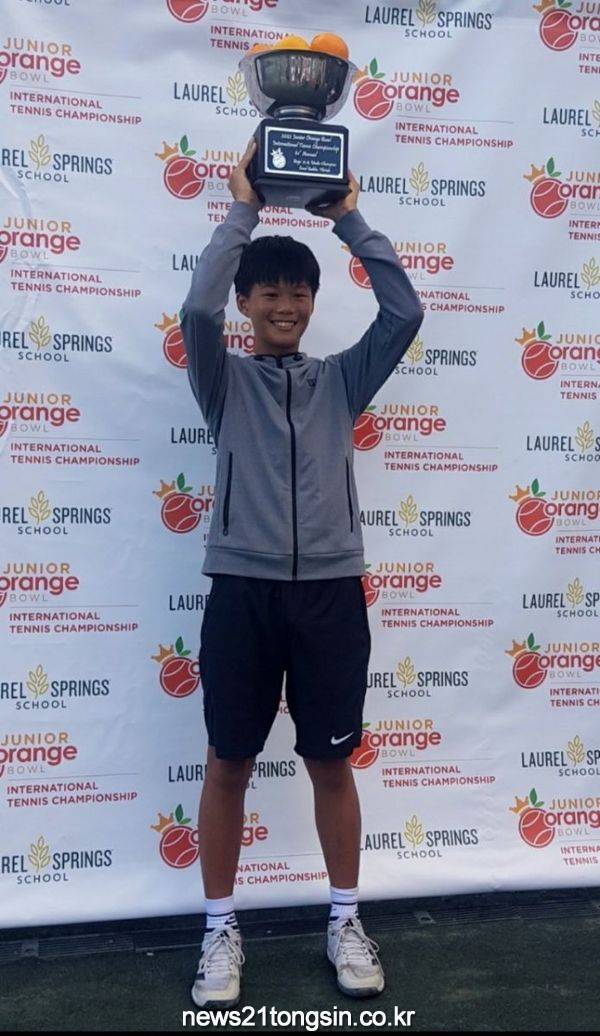 ▲ 사진제공=한국초등테니스연맹한국 테니스 유망주 김동재(군위초)가 세계적 권위의 2022 오렌지볼 테니스대회 12세부에서 우승컵을 들어올렸다.
