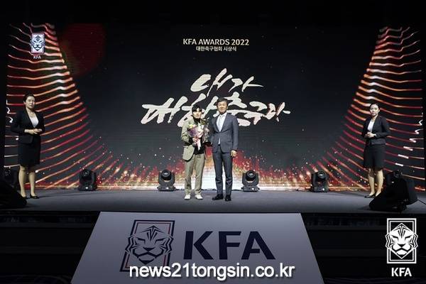 23일 서울 웨스틴조선호텔에서 열린 2022 KFA 어워즈에서 올해의 선수상을 받은 지소연은 “올해 여자아시안컵에서 대표팀이 처음으로 준우승을 차지했다. 팀 동료들과 함께 만들어낸 값진 성과인데 혼자 이렇게 큰 상을 받게 돼 미안하다. 선수들이 농담으로 ‘이제 그만 받아도 되지 않나’라고 하던데, 큰 상을 주셔서 정말 감사하다”는 소감을 밝혔다.